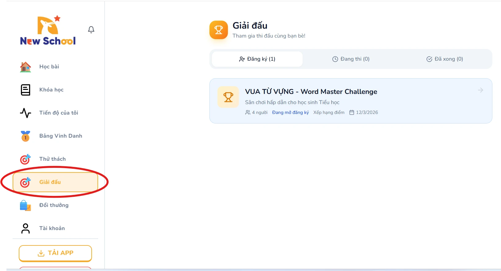 🎓Để tham gia Vua Từ vựng, các con vào App NewSchool, chọn Giải đấu và Ấn đăng ký.