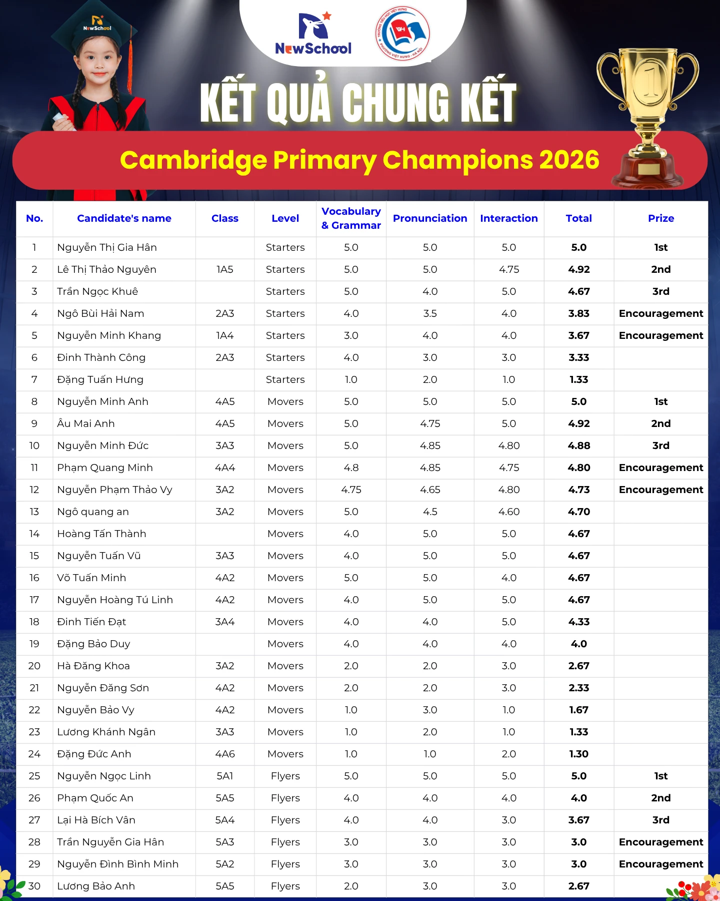 Ban tổ chức cuộc thi Cambridge Primary Champions 2026 tại Cụm thi Trường Tiểu học Việt Hưng trân trọng thông báo kết quả và chúc mừng các em học sinh đã đạt thành tích xuất sắc trong kỳ thi: