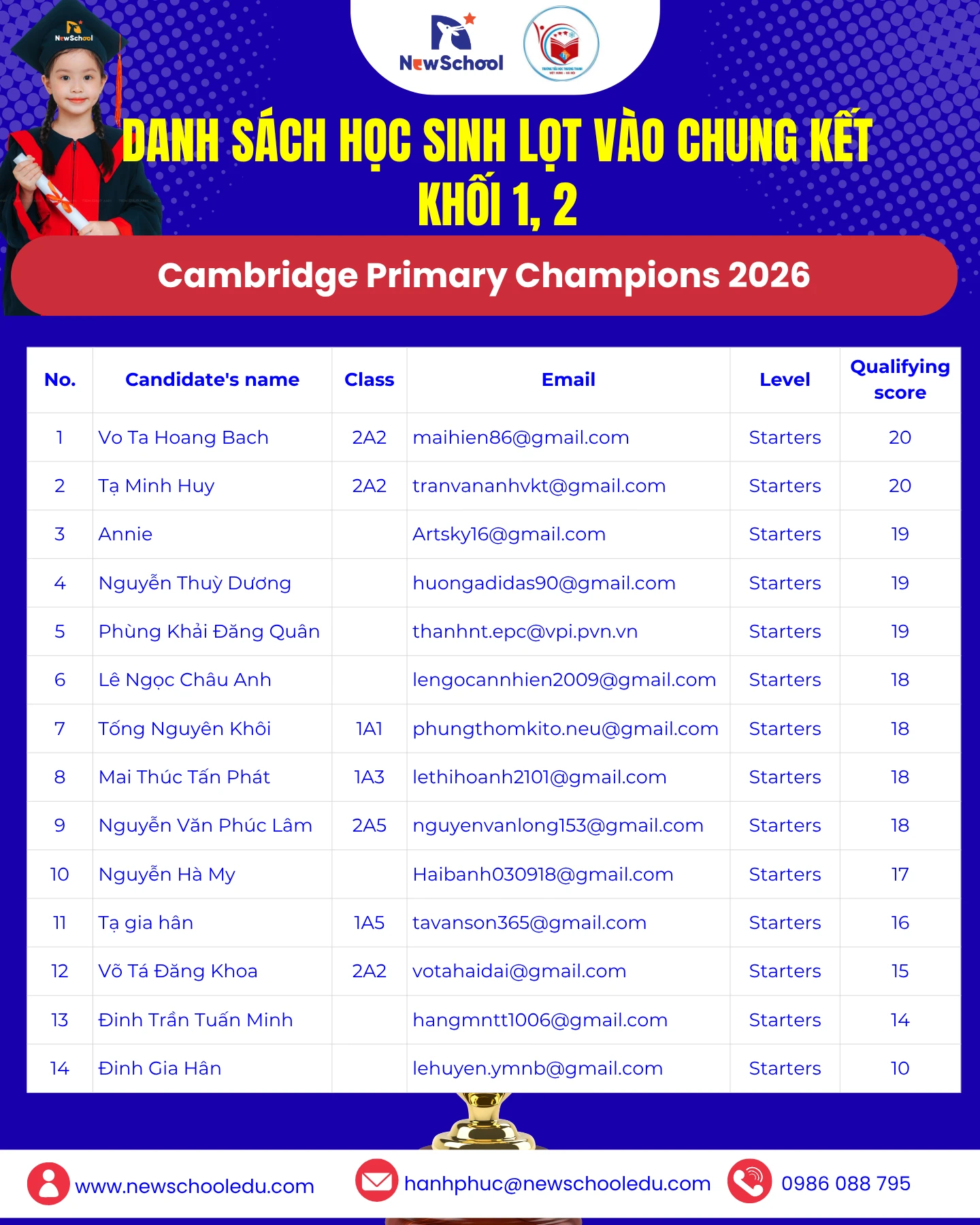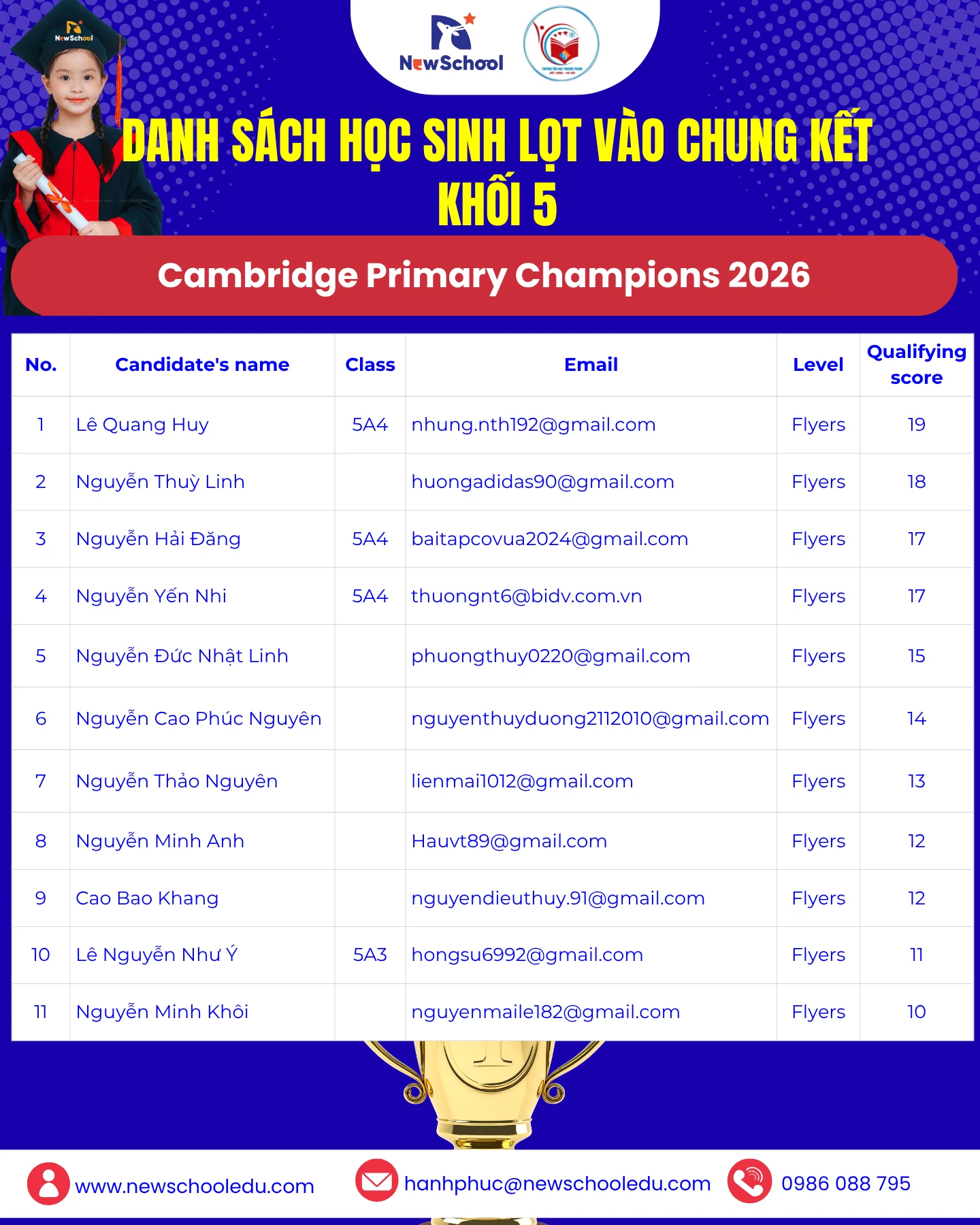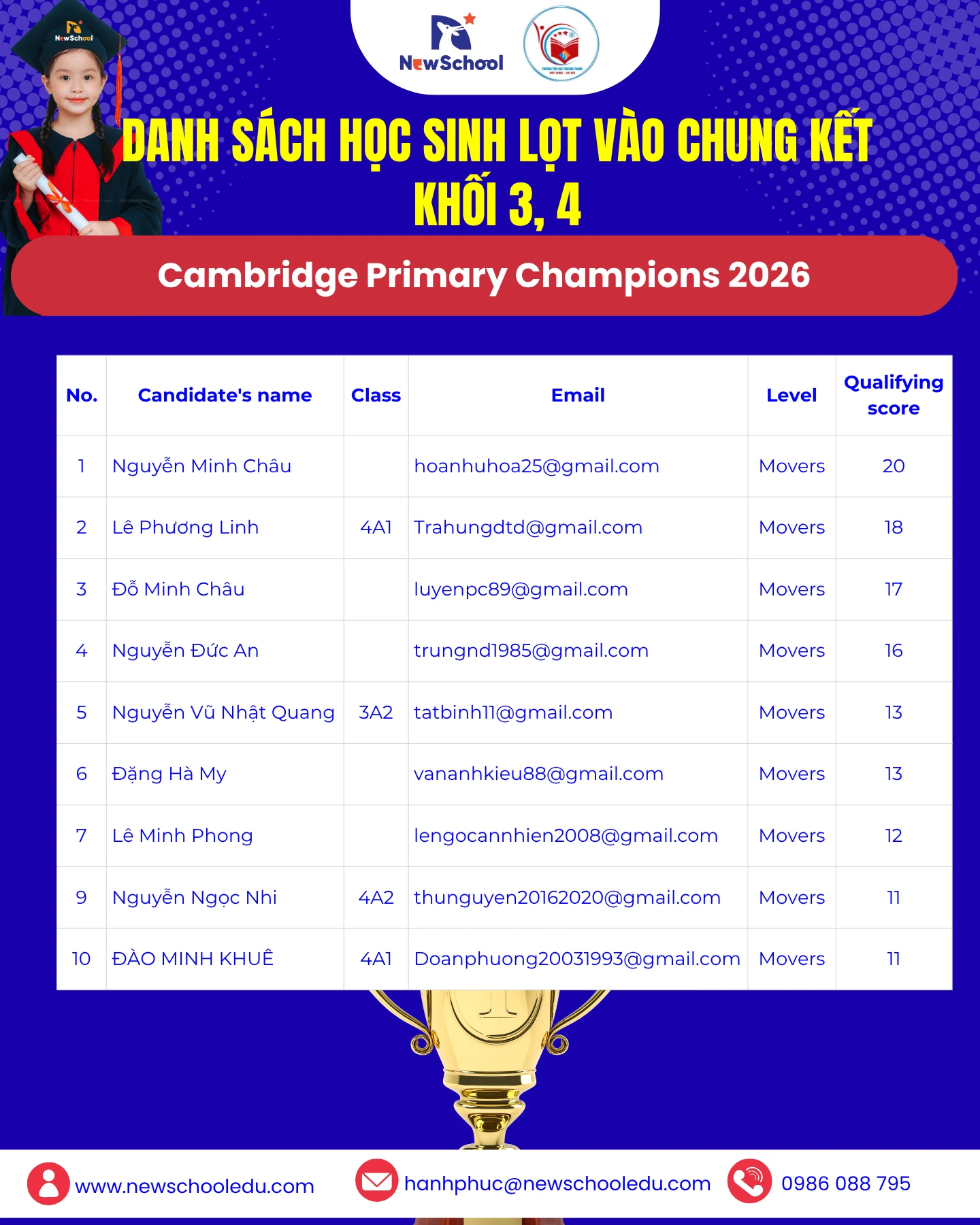 Ban tổ chức trân trọng thông báo và xin chúc mừng các học sinh đã xuất sắc lọt vào vòng Chung kết cuộc thi tiếng Anh Cambridge Primary Champions 2026: